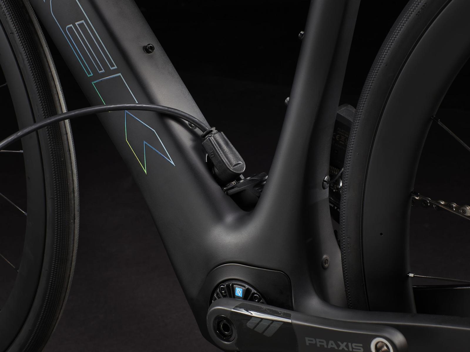 Einen �u�erst leichten Rahmen aus 800 Series OCLV Carbon mit hinterem IsoSpeed. Einen kraftvollen Harmonic Pinring-Motor von TQ mit einem Drehmoment von 50 Nm, der dich bis zu einer Geschwindigkeit von 25 km/h unterst�tzt, einen 360 Wh gro�en integrierten Akku, ein in den Rahmen integriertes, smartes LED-Display und diskret in die Bremsgriffgummis verbaute Bedienelemente f�r das Umschalten der Unterst�tzungsmodi. Aeolus Pro 37-Laufr�der aus OCLV Carbon, eine drahtlose, elektronische Shimano 105 Di2 2x12-Schaltung, eine Carbonkurbelgarnitur, ein vibrationsd�mpfender Bontrager Pro IsoCore-Lenker und ein RCS Pro-Vorbau mit vollst�n