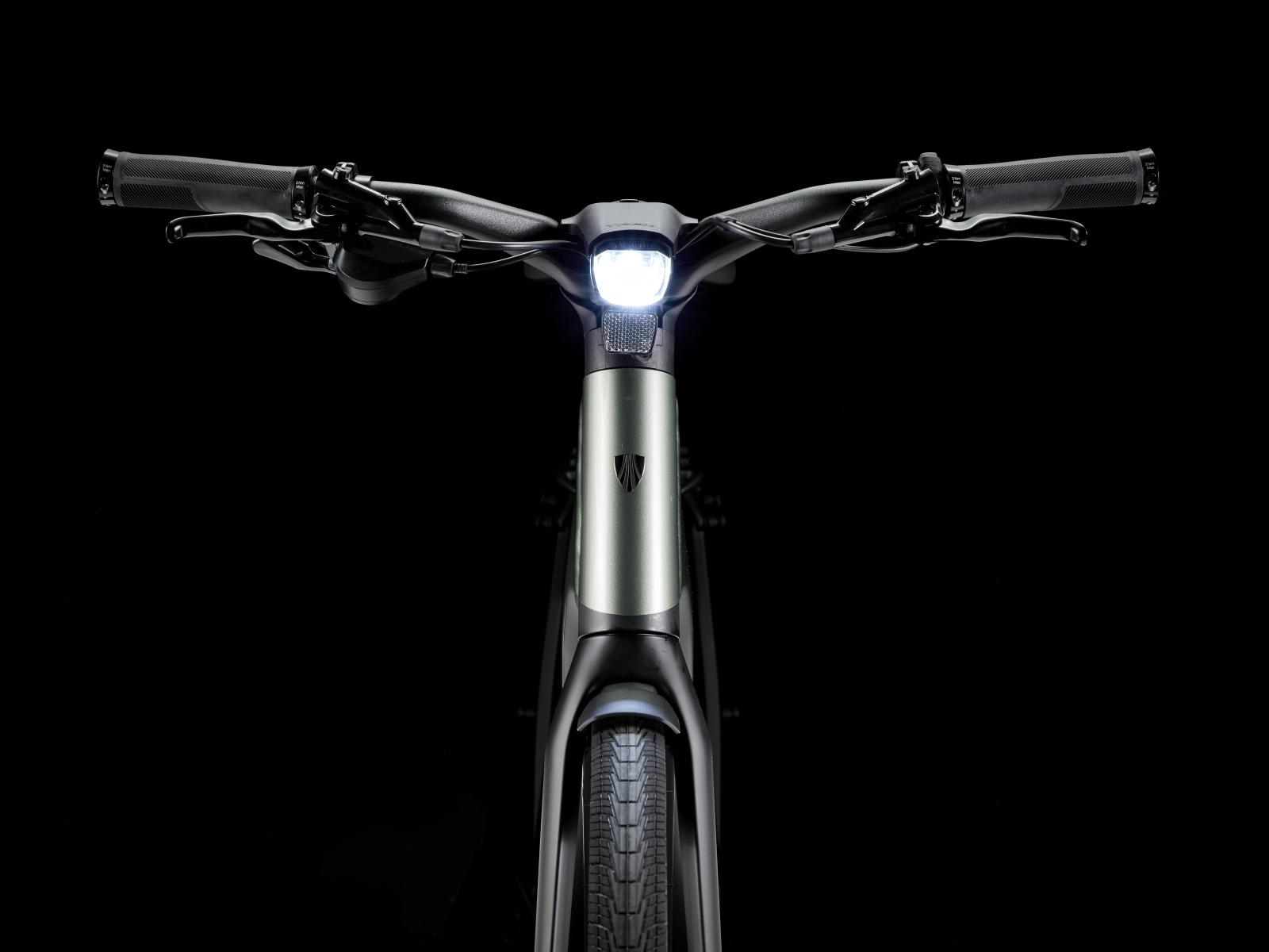 Einen schlanken Rahmen aus Alpha Platinum Aluminium samt Carbongabel. Einen leisen und kompakten TQ-HPR50 Motor mit 250 W Leistung und 50 Nm Drehmoment zur Unterstützung von Geschwindigkeiten bis 25 km/h, einen Akku mit 360 Wh Kapazität und ein integriertes LED-Display. Eine Shimano CUES U6000 10-Gang-Schaltung für geschmeidige Gangwechsel, kräftig zupackende, hydraulische Scheibenbremsen und 700C-Laufräder mit griffigen 40-mm-Reifen. Darüber hinaus kommt es mit allem, was du für den Arbeitsweg brauchst: integrierte Beleuchtung, Seitenständer und MIK-kompatiblen Heckgepäckträger.