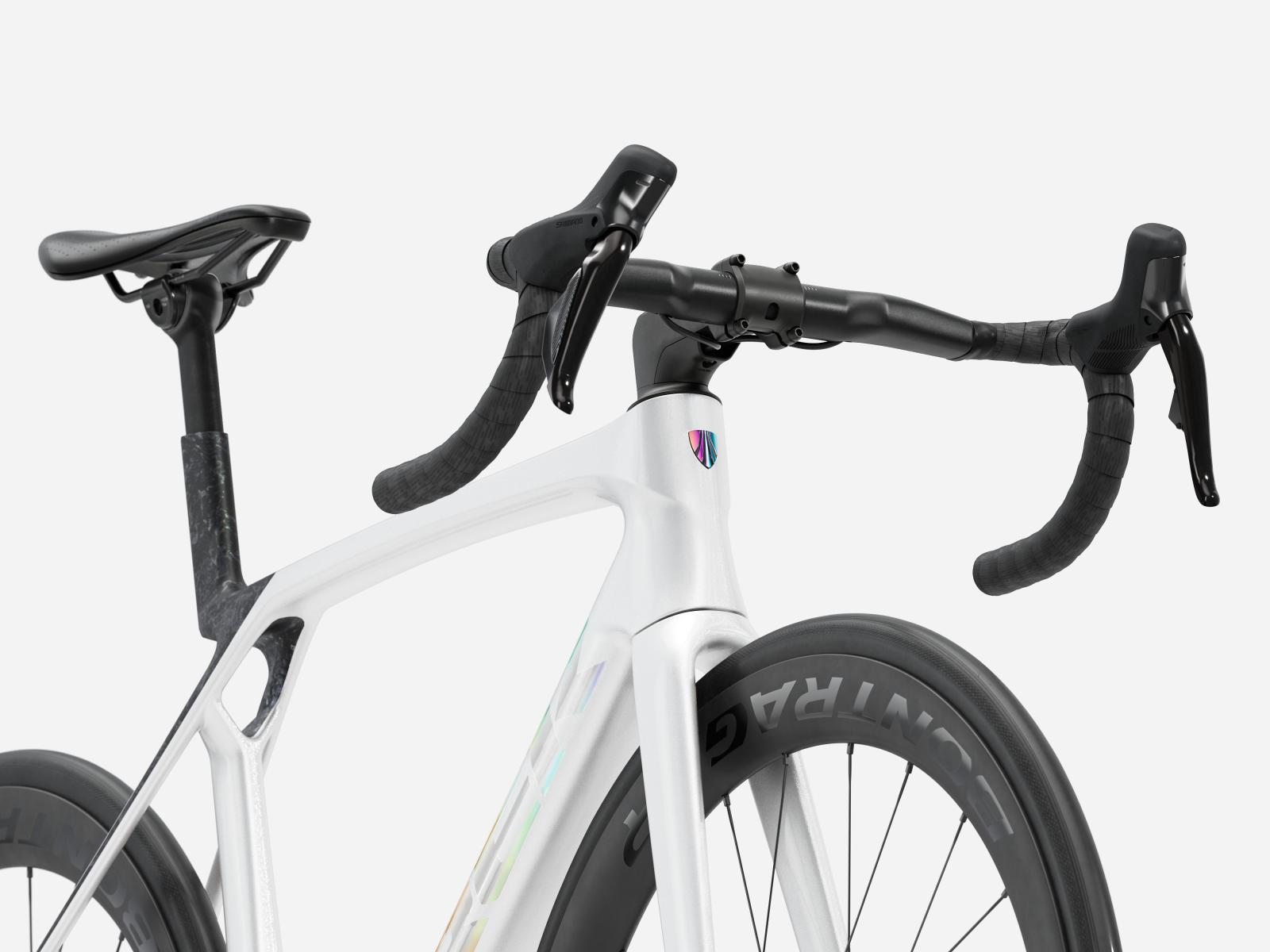 Der im Vergleich zum Unterlenker schmalere Oberlenker des Madone Gen 8 ermöglicht eine auf Aerodynamik oder Power optimierte Positionierung auf dem Bike. Und dank zweiteiligem Lenker/Vorbau-Design lässt sich die Passform schnell und einfach anpassen.