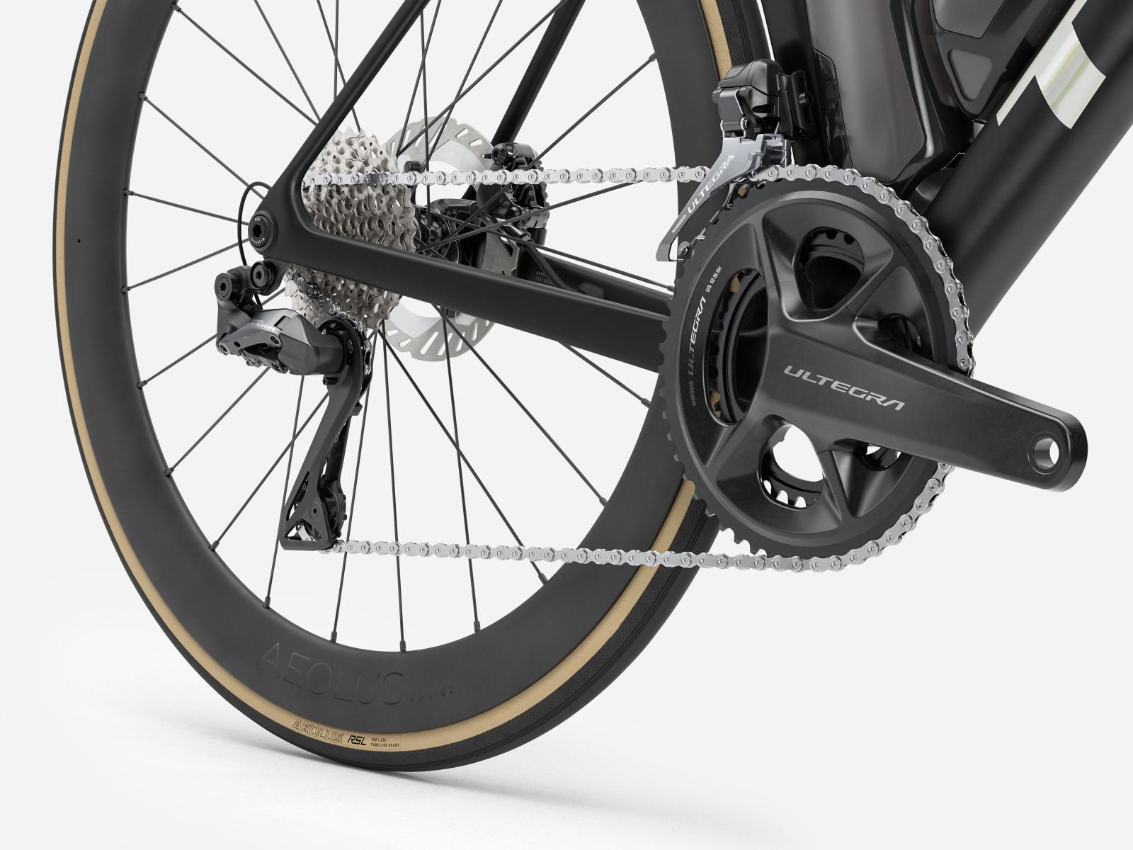 Einen unglaublich leichten, aerodynamisch optimierten Rahmen aus unserem besten 900 Series OCLV Carbon samt IsoFlow-Komforttechnologie und Watt-sparenden RSL Aero Trinkflaschen und Flaschenhaltern. Einen blitzschnell schaltenden Shimano Ultegra Di2 2x12-Antrieb, der sich individuell programmieren l�sst, w�hrend das verbaute, weit verbreitete Universalschaltauge (UDH) die Ersatzteilbeschaffung erleichtert. Abgerundet wird die Ausstattung von schlauchlosen Bontrager Aeolus Pro 51 Carbonlaufr�dern und einer einteiligen Trek Aero RSL Lenker/Vorbau-Einheit.