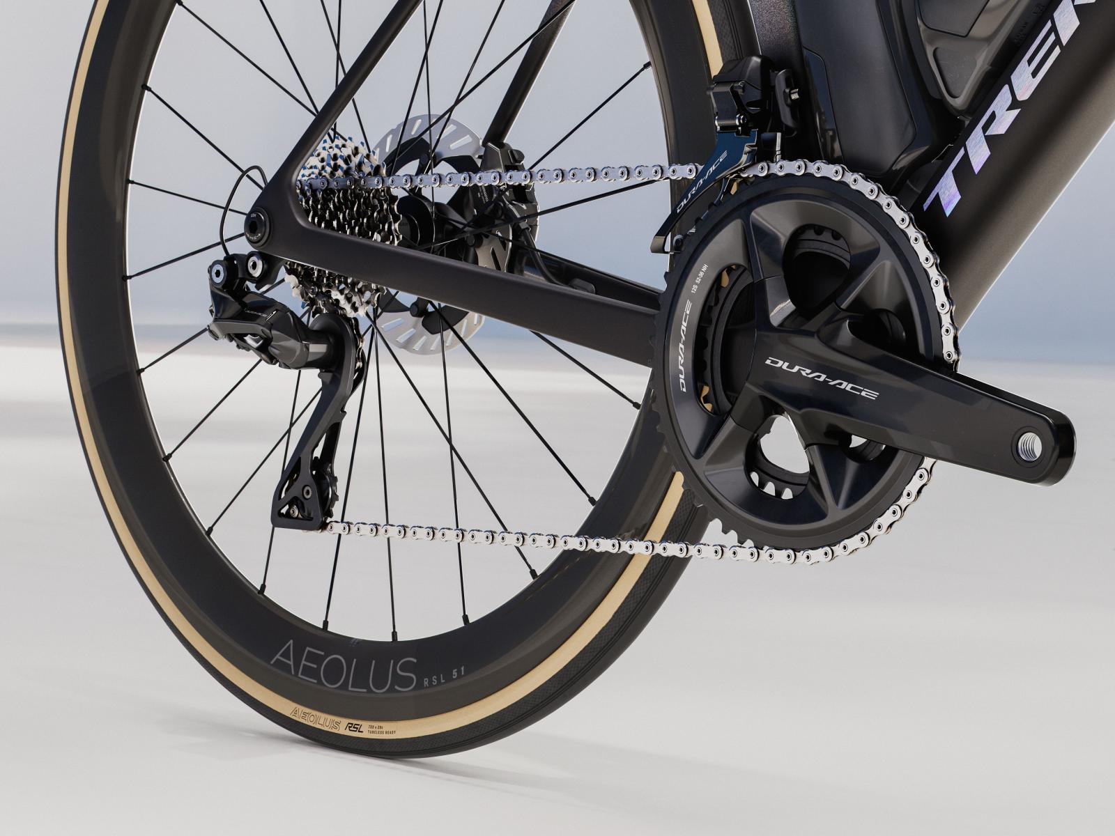 Einen unglaublich leichten, aerodynamisch optimierten Rahmen aus unserem besten 900 Series OCLV Carbon samt IsoFlow-Komforttechnologie und Watt-sparenden RSL Aero Trinkflaschen und Flaschenhaltern. Die blitzschnell schaltende, programmierbare Dura-Ace Di2 ist Shimanos beste Rennradgruppe, während das verbaute, weit verbreitete Universalschaltauge (UDH) die Ersatzteilbeschaffung erleichtert. Abgerundet wird die Ausstattung von schlauchlosen Bontrager Aeolus RSL 51 Carbonlaufrädern und einer einteiligen Trek Aero RSL Lenker/Vorbau-Einheit.