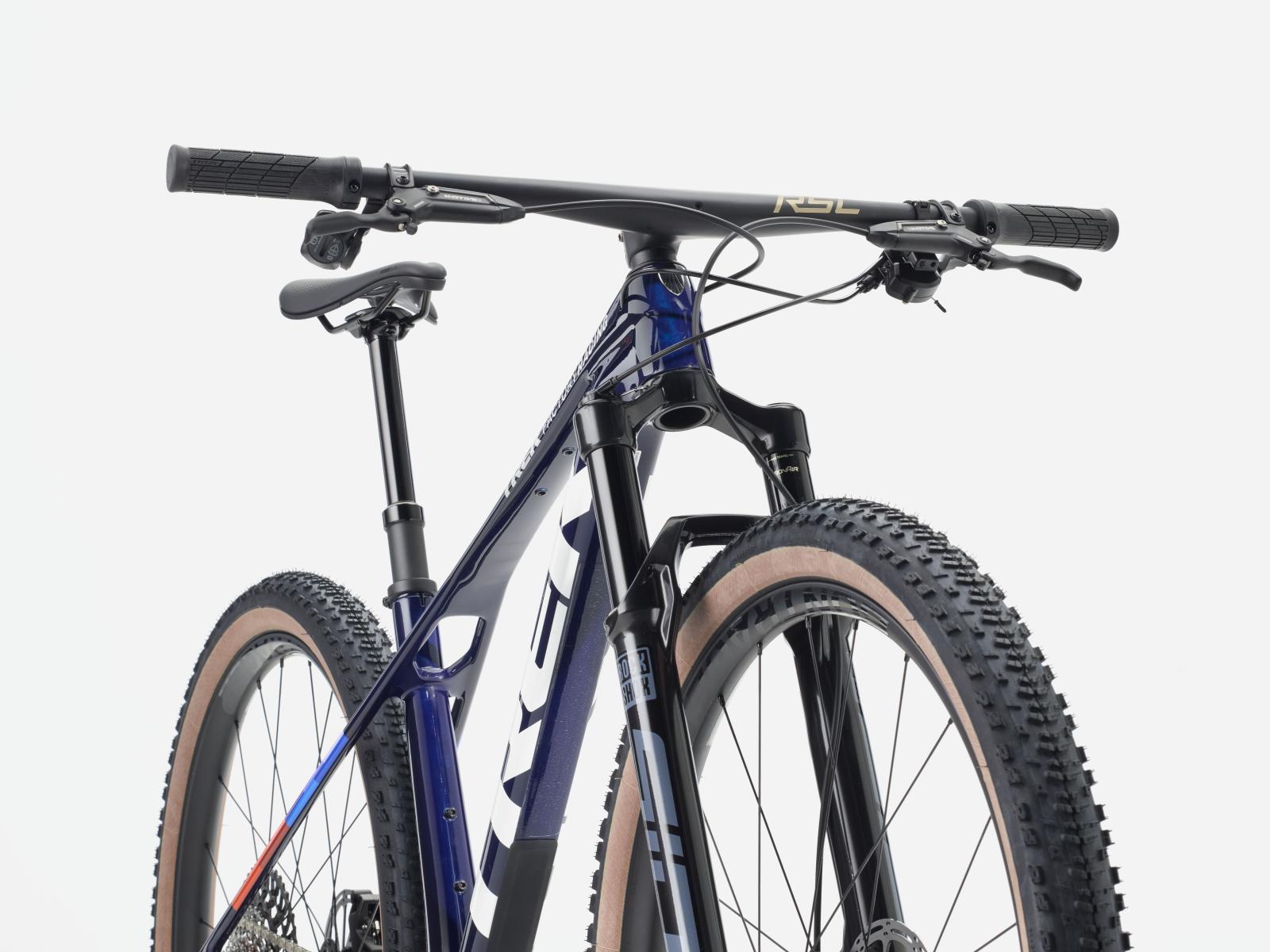 Einen Rahmen aus OCLV Mountain Carbon mit dem einzigartigen Vorteil der trailgl�ttenden IsoBow-Technologie. Eine RockShox SID Gabel mit 120 mm Federweg, DebonAir Feder, Rush RL D�mpfung und Remote-Lockout. Eine komplett drahtlose elektronische SRAM GX AXS 12fach-Transmission, hydraulische SRAM Level Bronze 4-Kolben-Scheibenbremsen, 29 Zoll gro�e Bontrager Kovee Elite 30 Carbonlaufr�der und eine integrierte Bontrager RSL Lenker/Vorbau-Einheit aus Carbon.