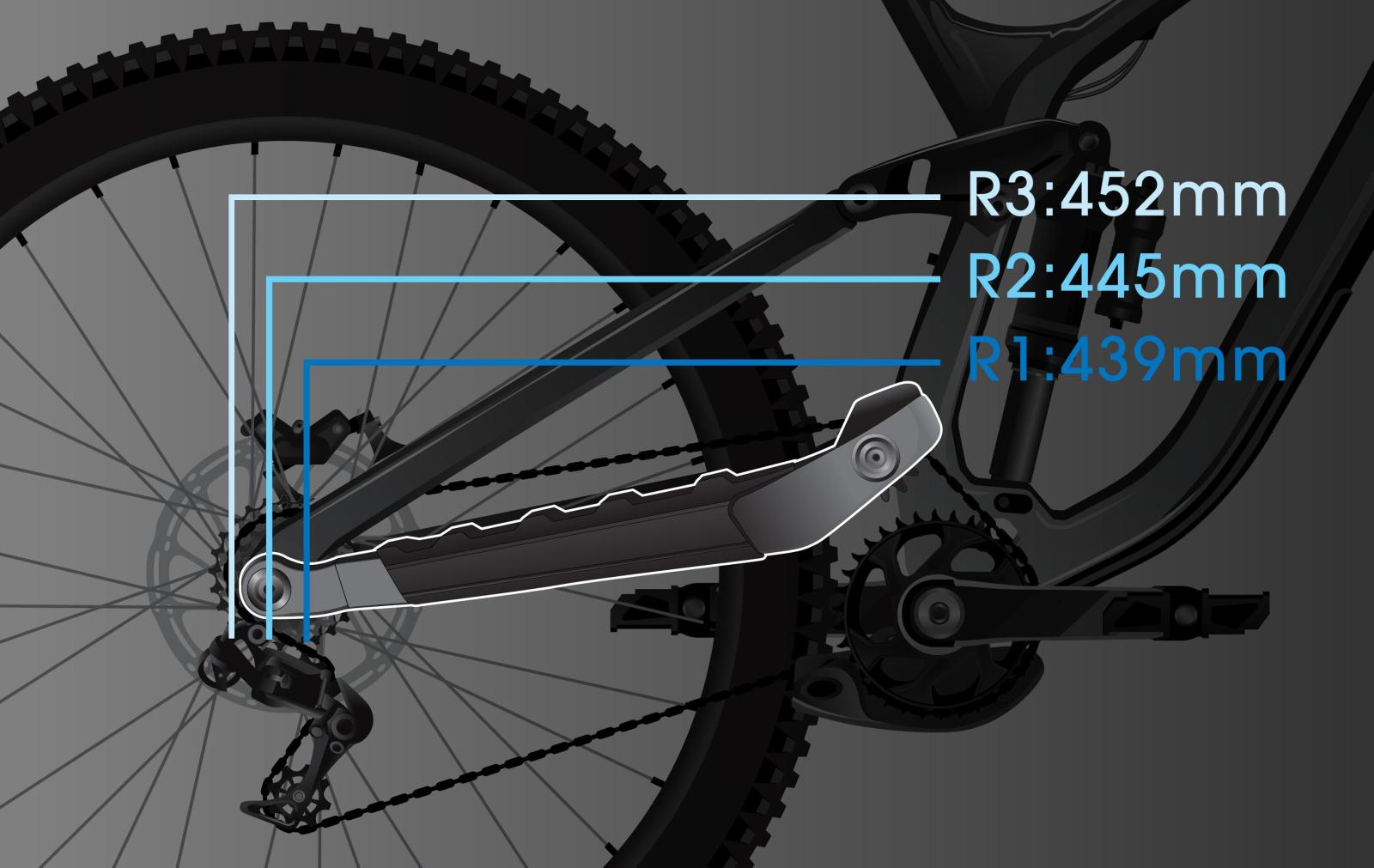 Die Kettenstrebenl�nge, also der hintere Mittelpunkt, w�chst mit dem Rahmen, sodass die Gewichtsverteilung in jeder Rahmengr��e gleich ausgewogen ist. Highspeed-Kontrolle und Abfahrtsspa� f�r alle.