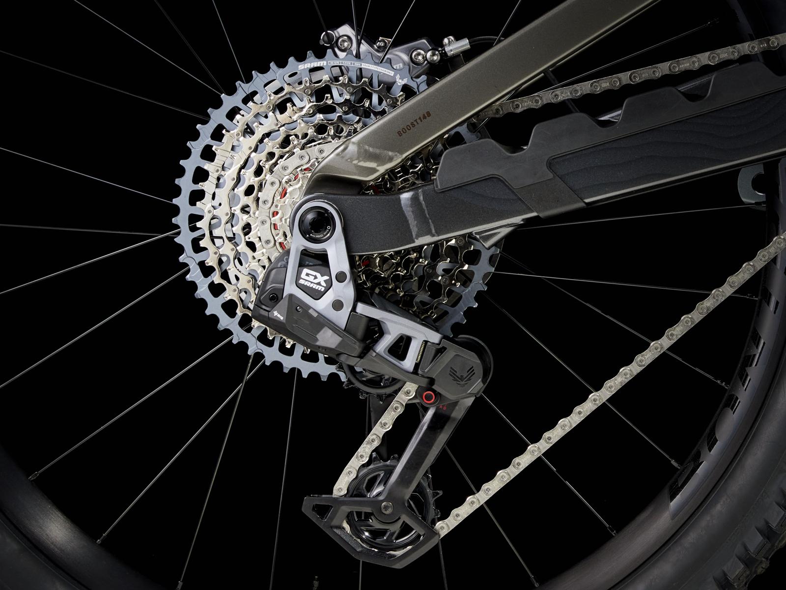 Einen Rahmen aus Alpha Platinum Aluminium mit High-Pivot-Fahrwerk und Umlenkrolle sowie ein Rahmenstaufach. Eine RockShox ZEB Select+ Gabel mit 170 mm Federweg, DebonAir Federung und Charger 3 RC2 D�mpfung und einen RockShox Vivid Select+ Hinterbaud�mpfer mit ebenfalls 170 mm Hub. Au�erdem die drahtlose SRAM GX AXS Transmission mit breiter �bersetzung f�r knackige Anstiege, eine Bontrager Line Variosattelst�tze und eine Mullet-Konfiguration (29" vorn, 27,5" hinten) mit Bontrager Line Comp 30 Tubeless-Ready-Laufr�dern samt Rapid Drive Nabe.