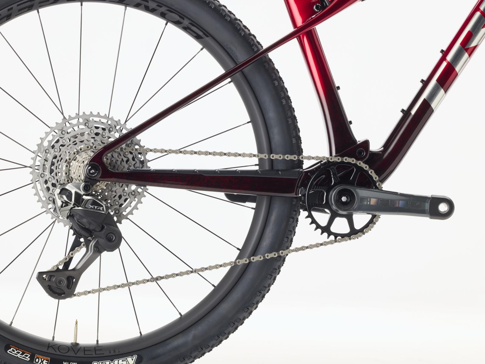 Einen federleichten Rahmen aus High-Modulus SLR OCLV Mountain Carbon mit moderner XC-Geometrie. Zudem eine Fox Factory 34 SL Step-Cast 110-mm-Federgabel mit Float EVOL Luftfederung, GRIP SL 2-Positionen-D�mpfung und Dual Remote-Lockout sowie einen RockShox SIDLuxe IsoStrut-D�mpfer mit 80 mm Federweg. Ein brandneuer drahtloser Shimano XTR Di2 12fach-Antrieb, Bontrager Kovee RSL Carbonlaufr�der, eine integrierte Bontrager RSL Lenker/Vorbau-Einheit aus Carbon, eine FOX Transfer SL Variosattelst�tze und hydraulische Shimano XTR M9200 Scheibenbremsen runden das Ausstattungspaket ab.