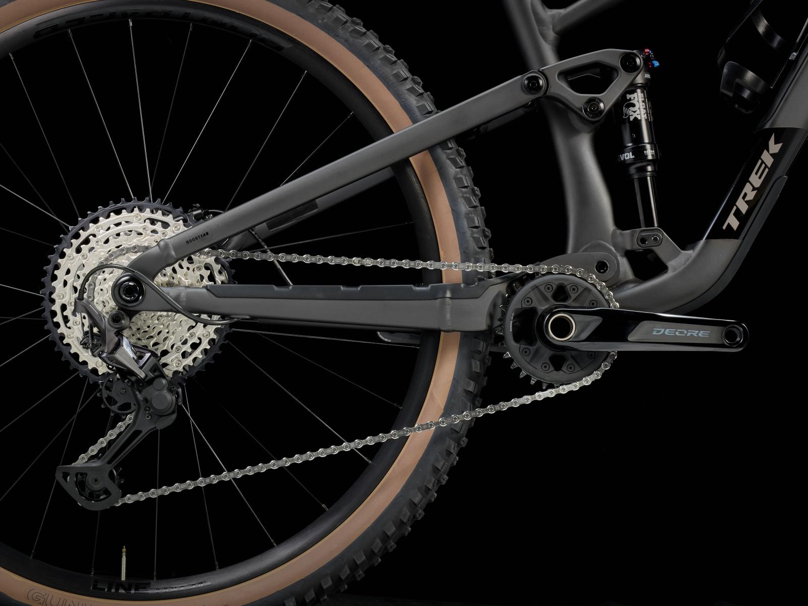 Einen Rahmen aus Alpha Platinum Aluminium mit vierfach verstellbarem Mino Link an der unteren D�mpferaufnahme zur Feinanpassung der Rahmengeometrie und des Hebelverh�ltnisses des Fahrwerks. Eine FOX Rhythm 34 Gabel mit 130 mm Federweg, Float EVOL Luftfeder und GRIP D�mpfung sowie einen FOX Performance Float Hinterbaud�mpfer mit 120 mm Federweg und 3-Positionen-D�mpfung. Abgerundet wird die Ausstattung von einer Shimano XT/SLX 12fach-Schaltung, hydraulischen Scheibenbremsen, einer Bontrager Line Variost�tze und Bontrager Line Comp 30 Tubeless-Ready-Laufr�dern.