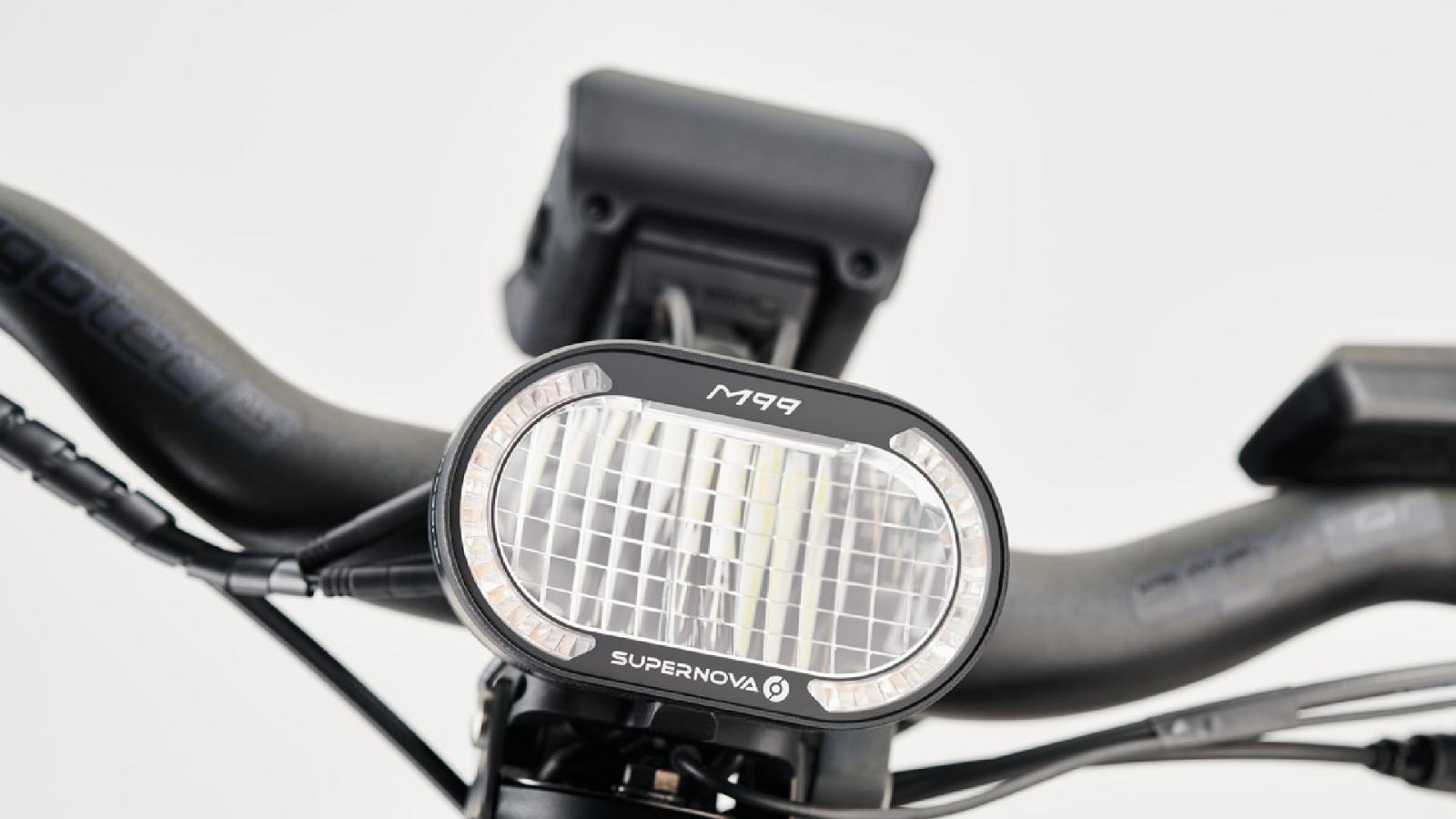 Vorderlicht: Supernova M99 Pro (1400lumen) mit Tagfahrlicht, Aufblendfunktion (2300 lumen) und integrierte Hupe // Supernova TL3 Pro mit Bremslichtfunktion und integri