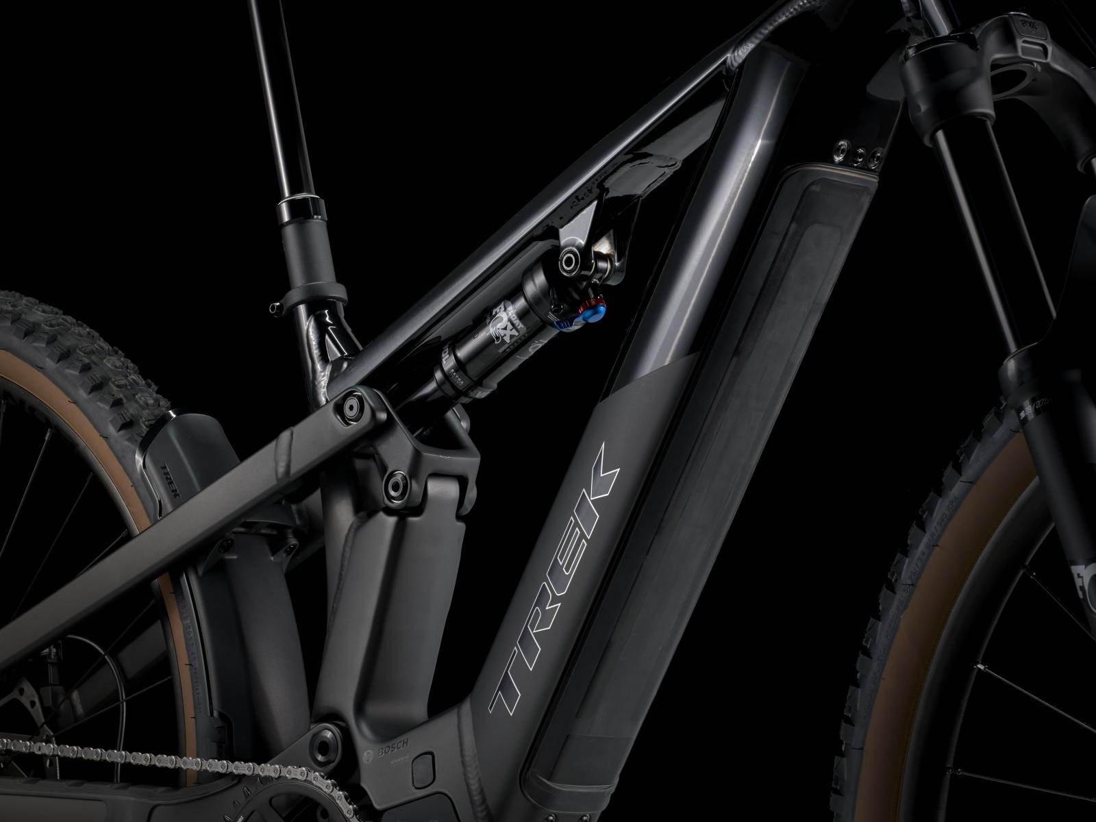 Einen Rahmen aus Alpha Platinum Aluminium mit einem Performance Line CX Antriebssystem von Bosch mit 250 W Leistung und 85 Nm Drehmoment samt abnehmbarem, integriertem PowerTube RIB 2.0 Akku mit massiven 800 Wh Kapazit�t und Purion 200 Controller. Das Fahrwerkpaket setzt sich aus einer FOX Float AWL Gabel mit 130 mm Federweg, Luftfederung und RAIL 2.0 D�mpfung und einem FOX Float Rhythm Hinterbaud�mpfer mit 120 mm Federweg zusammen. Tubeless-Ready-Laufr�der mit pannensicheren 2,4"-Reifen, eine Shimano SLX 12-Gang-Schaltung f�r saubere Gangwechsel, eine Bontrager Line Variosattelst�tze und hydraulische Scheibenbremsen.