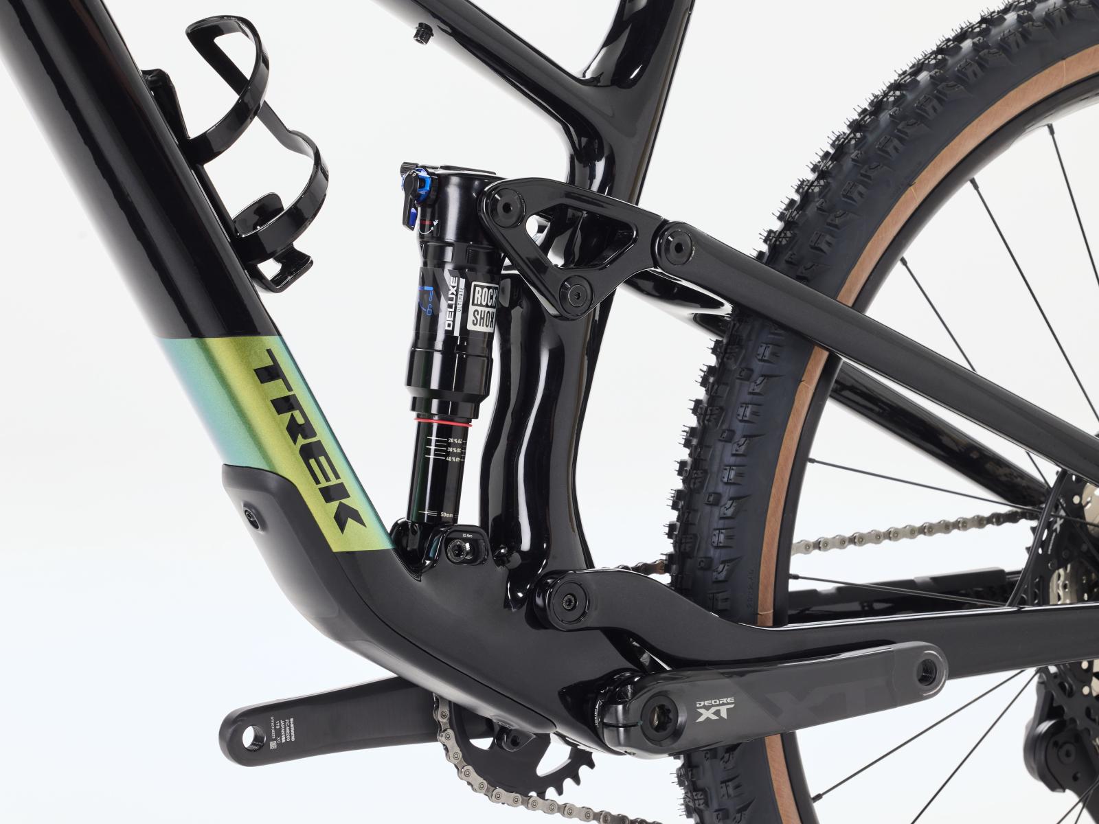 Einen Rahmen aus OCLV Mountain Carbon mit vierfach verstellbarem Mino Link an der unteren D�mpferaufnahme zur Feinanpassung der Rahmengeometrie und des Hebelverh�ltnisses des Fahrwerks. Eine RockShox Pike Select+ Gabel mit 130 mm Federweg, DebonAir Luftfeder und Charger 3.1 RC2 D�mpfung sowie einen RockShox Deluxe Ultimate RCT Hinterbaud�mpfer mit 120 mm Federweg. Shimanos brandneue drahtlose XT Di2 12-Gang-Schaltung, hydraulische Shimano XT 4-Kolben-Scheibenbremsen, eine Bontrager Line Variosattelst�tze und Bontrager Line Comp 30 Tubeless-Ready-Laufr�der runden das hochwertige Ausstattungspaket ab.